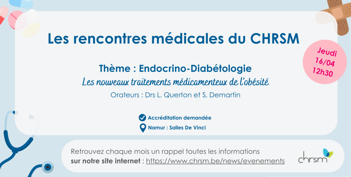 La prochaine Rencontre Médicale du CHRSM – site Meuse se tiendra le jeudi 16/04 de 12h30 à 13h30. Le sujet de cette rencontre sera présenté par les Drs Quentin et Demartin : Les nouveaux traitements médicamenteux de l’obésité.