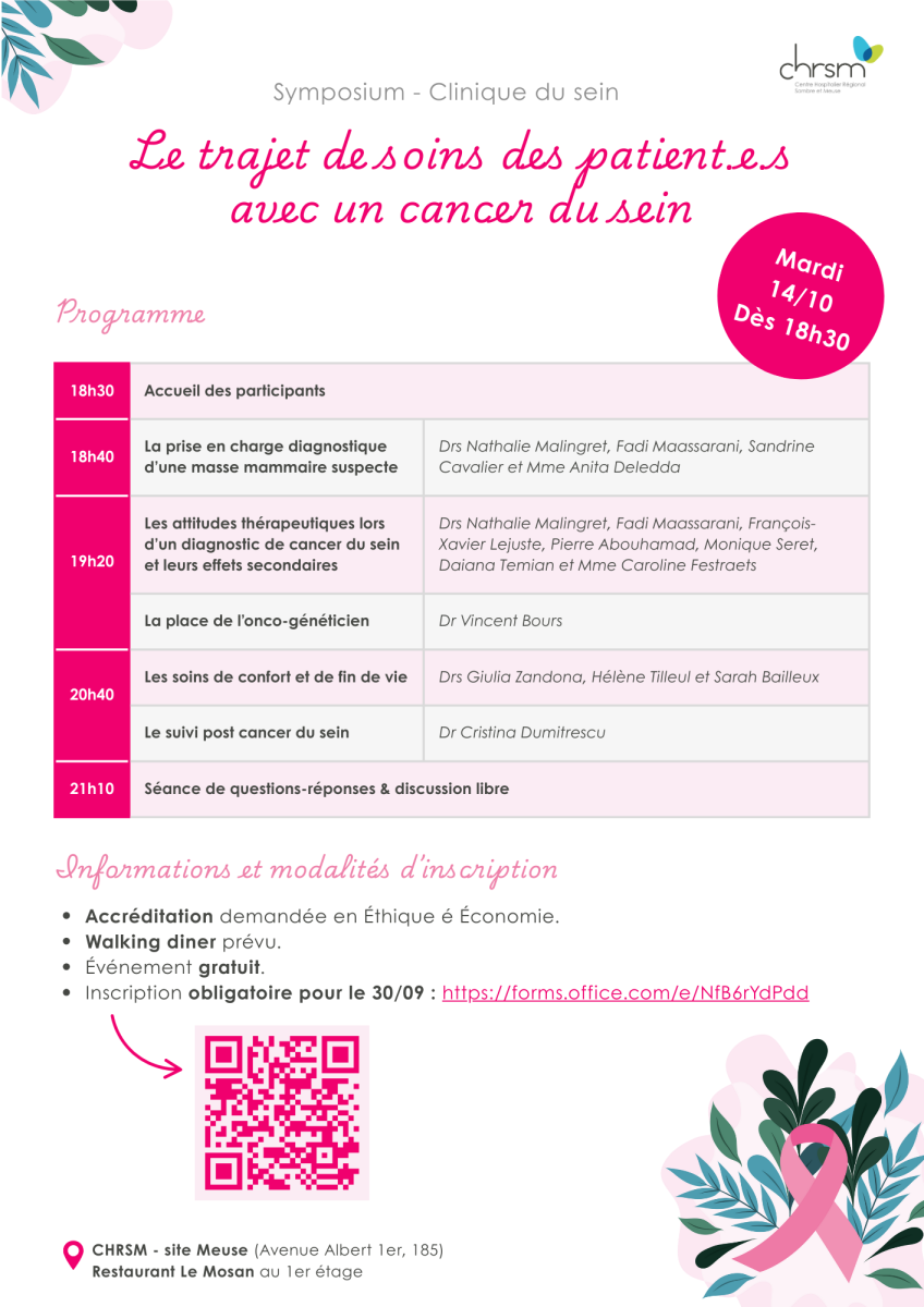 La clinique du sein du CHRSM vous convie à un Symposium pluridisciplinaire sur le parcours de soins des patient.e.s avec un cancer du sein le mardi 14 octobre en soirée.